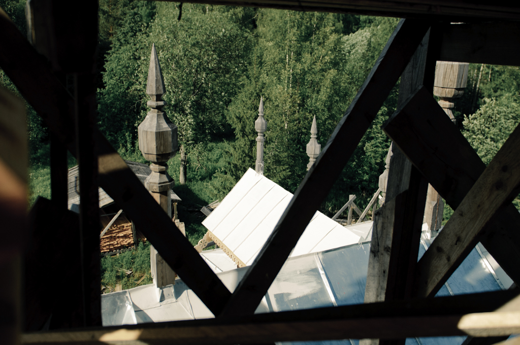 [su_column size=»5/6″]Надо сказать, что реставрационные стандарты весьма строги. Отслужившие свое детали позволяется заменять репликами, но при условии использования того же материала и сохранении методов работы с ним. То есть, как если бы ремонт делался во времена постройки здания. Эти правила неукоснительно соблюдаются в отношении объектов, официально признанных культурным наследием, когда заказчиком реставрации выступает государство. Наш терем не таков, реставрируется в частном порядке, но заказчик, надо отдать ему должное, старается придерживаться стандартов. Есть, правда, некоторые исключения. Дело в том, что терем был спроектирован и построен непрофессионалом, поэтому в конструкции допущена масса просчетов. Например, масса кладки печей распределена таким образом, что несущие деревянные конструкции просто не в состоянии служить достаточно долго. В этих местах пришлось отступить от стандарта и усилить деревянную конструкцию металлом. Другой ляп зодчего — в местах сопряжения кровли основного здания и башенки (хорошо видна на снимке) создавались углубления, в которых скапливался снег. В результате угол полностью сгнил.[/su_column]
